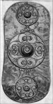 One of their early settlements has been found at Wittenham Clumps near Dorchester but this bronze Celtic shield was found in the River Thames at Battersea. It has had the enamelling restored. |