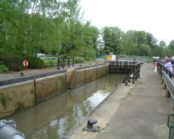 Godstow lock was built of stone by the Thames Navigation Commissioners in 1790. The Thames Conservancy rebuilt the lock using concrete and steel piling in 1924. It was the last lock on the Thames to be mechanised. All the locks above Godstow are still manually operated. |