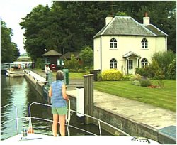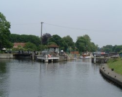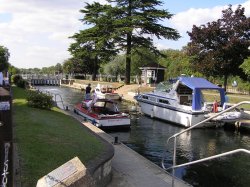 The Thames Navigation Commissioners built the first pound lock here in 1822. It was rebuilt by the Thames Conservancy in 1889 and again in 1957 when it was constructed of pre-stressed concrete. It was also built with electric controls but these were changed to a hydraulic system in 1965. The current lock keepers house was built in 1930. This is one of the locks on the Thames that has power available for the public to use when they are operating the lock outside normal opening hours. |